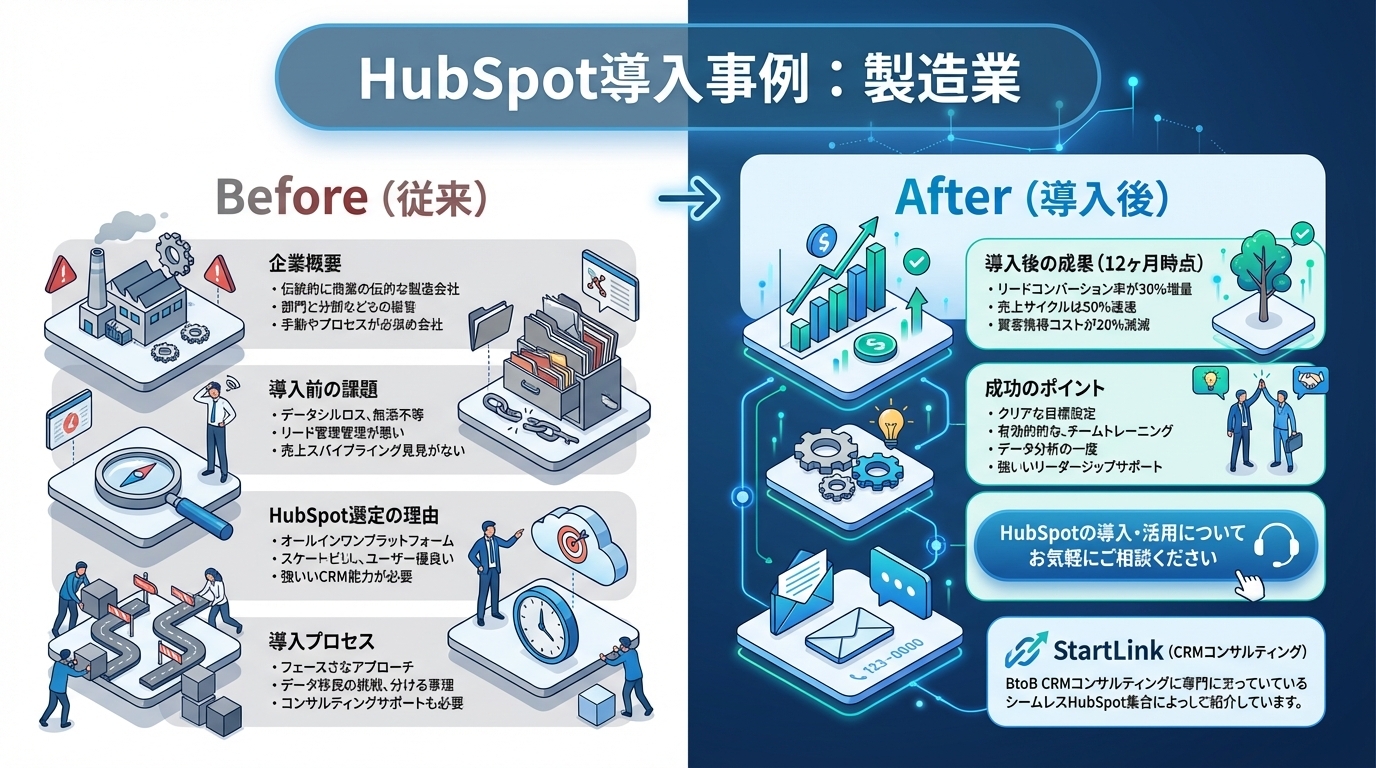 この記事では、ある製造業企業がHubSpotを導入し、属人営業からデータドリブン組織へ変革した具体的なプロセスと成果を紹介します。