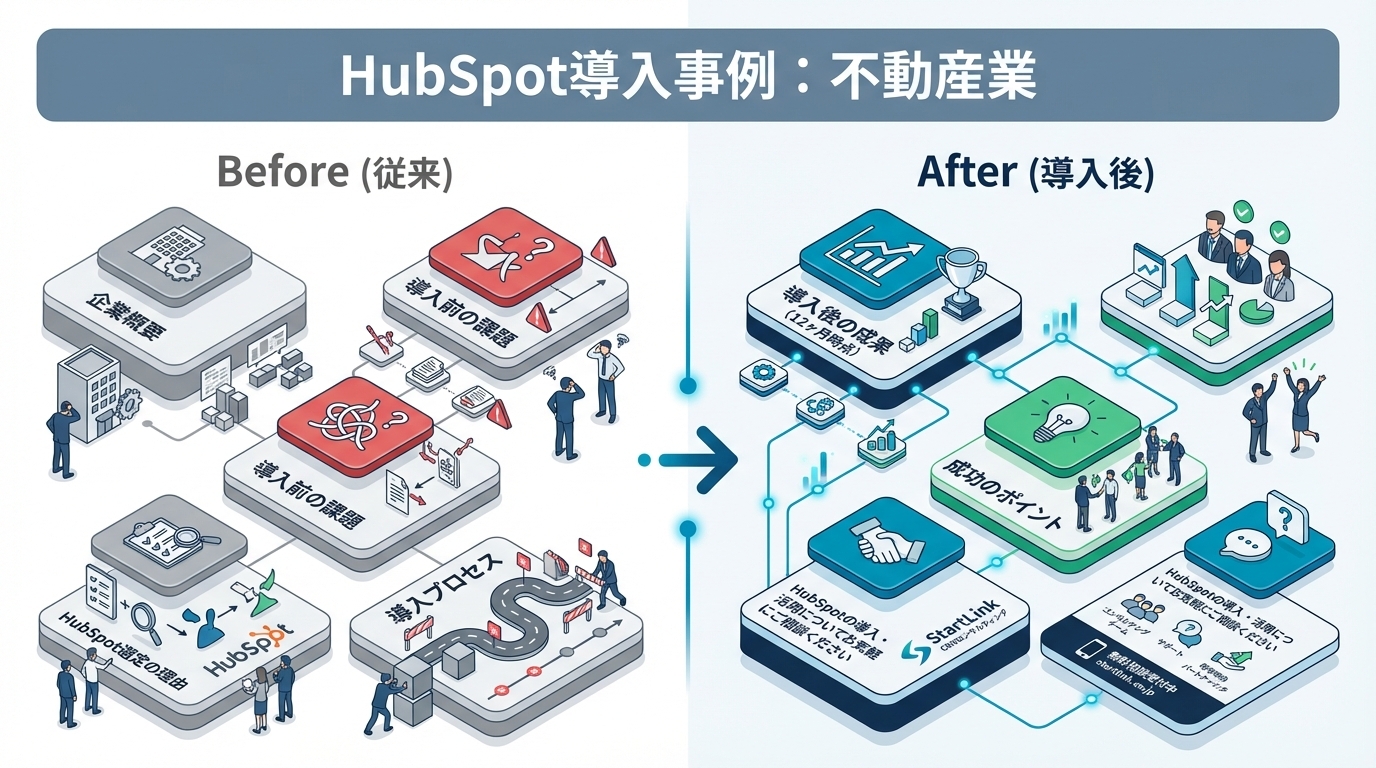 不動産業界におけるHubSpot導入は、反響対応の自動化と長期追客の仕組み化により、成約率と営業効率を同時に向上させるプロセスです