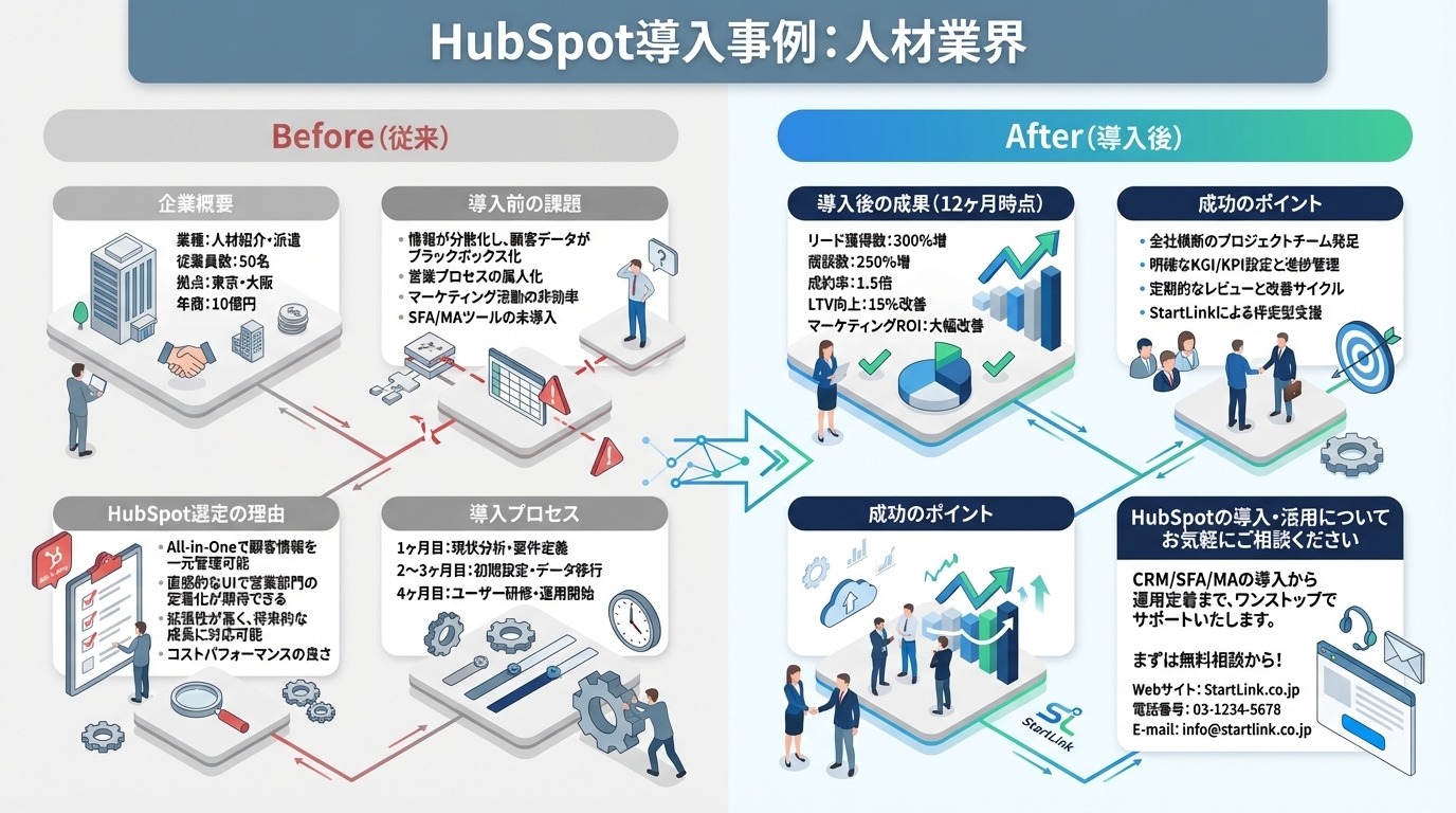 人材業界におけるHubSpot導入は、求職者と企業の双方向データを一元管理し、マッチング精度と営業効率を同時に向上させるプロセスです