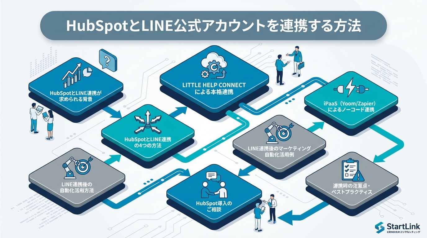 HubSpotとLINE公式アカウントの連携とは、LINEの友だち情報やメッセージ履歴をHubSpot CRMに統合し、顧客データの一元管理とLINEを活用したマーケティング自動化を実現する仕組みです。 LITTLE HELP CONNECTやHubSpot LINE OA、iPaaS(Yoom/Zapier)など複数の連携方法があり、自社の規模や目的に応じて最適な方法を選択できます。