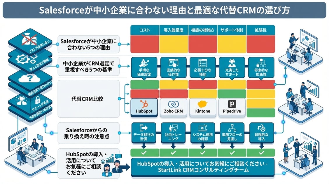 Salesforceは優れたCRMプラットフォームですが、中小企業にとっては「コスト」「運用の複雑さ」「機能過多」「MA別売り」「スモールスタートの難しさ」が障壁になりやすいのが現実です。