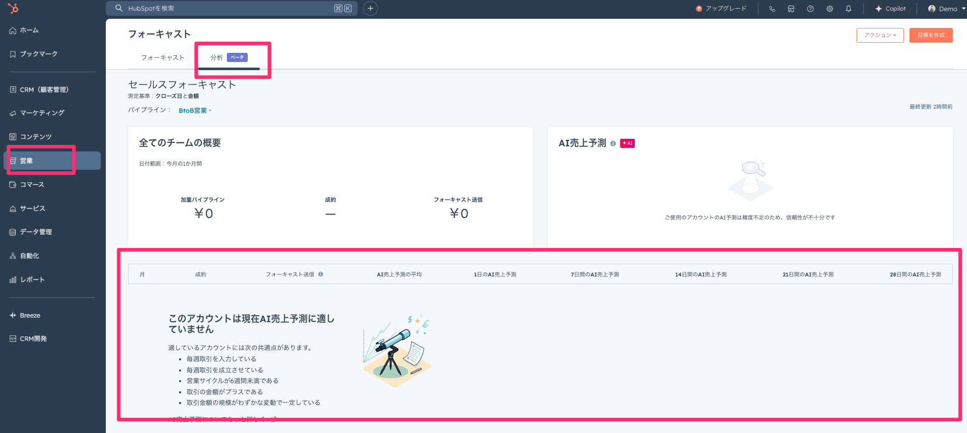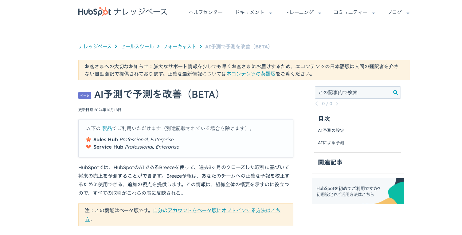 BreezeのAI受注予測は、現在パブリックベータ版としてSales Hub Pro以上/Service Pro以上のユーザー向けに提供されています。