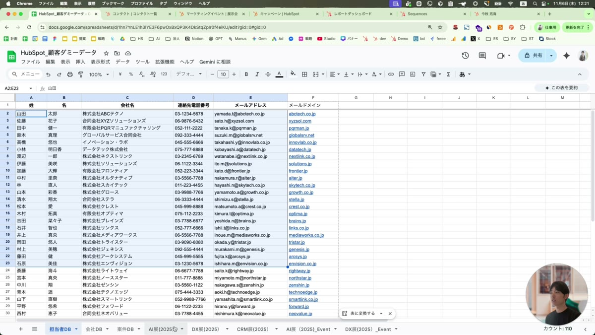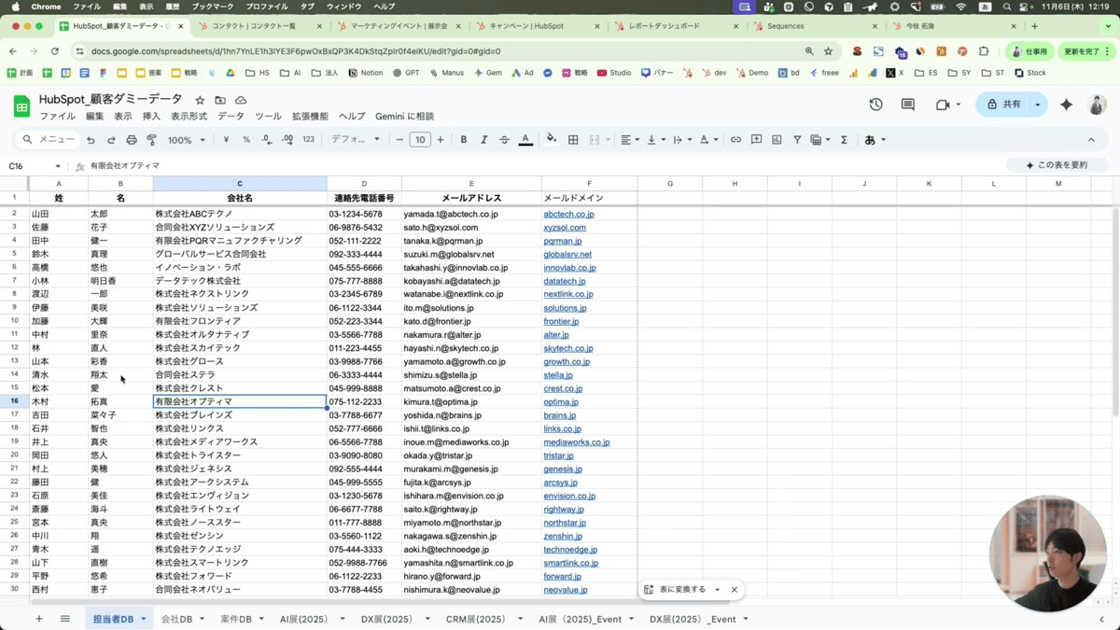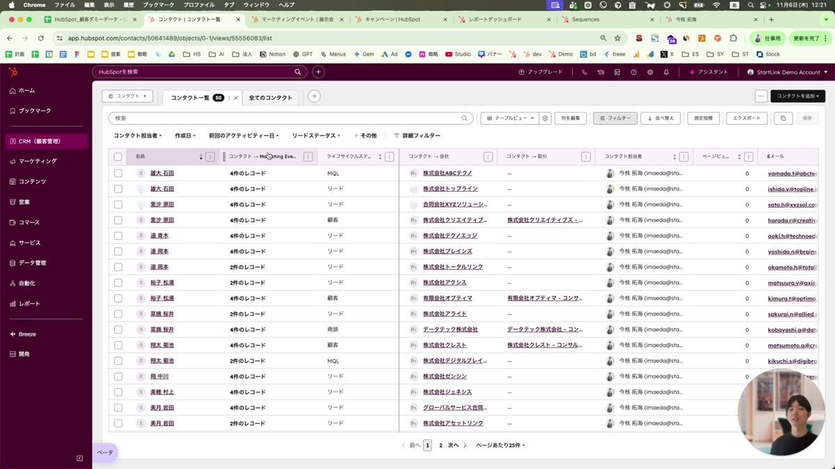 重要なのは、データが自動的に連携されることです。イベントに参加者を登録すると、そのコンタクト・会社情報は自動的にHubSpotのデータベースに紐付けられます。スプレッドシートのように重複データが発生することはありません。