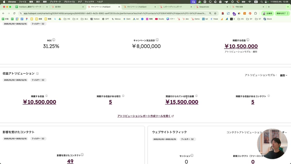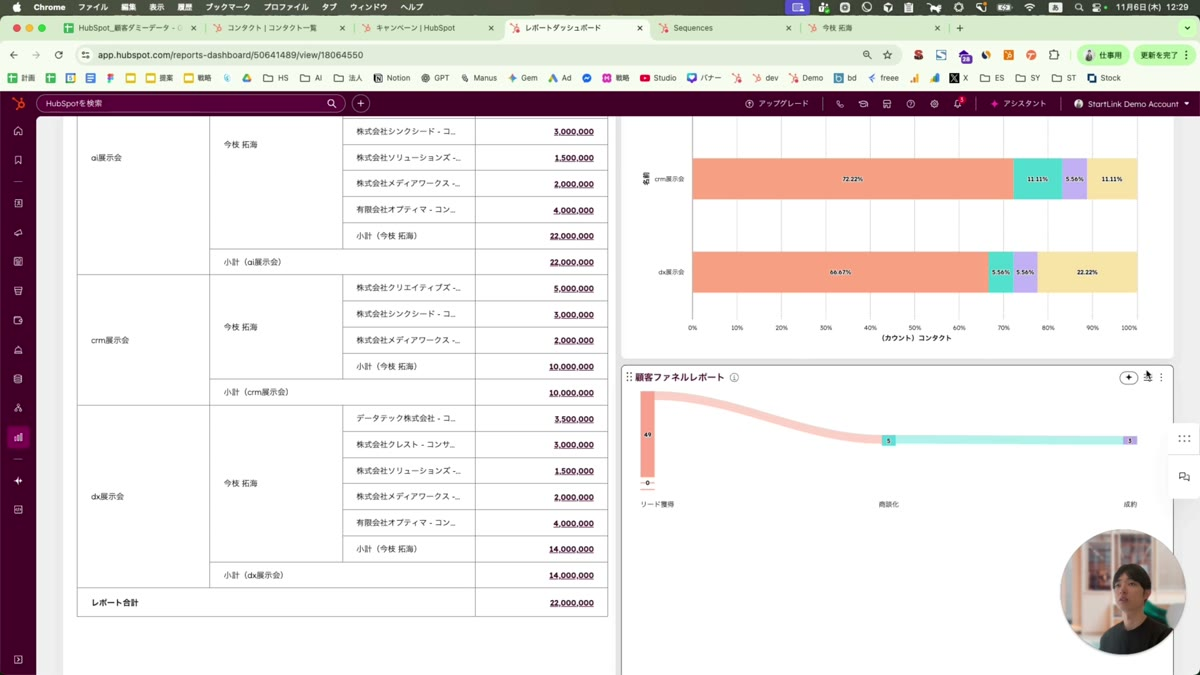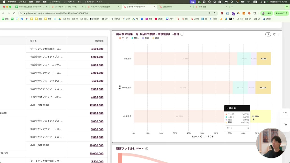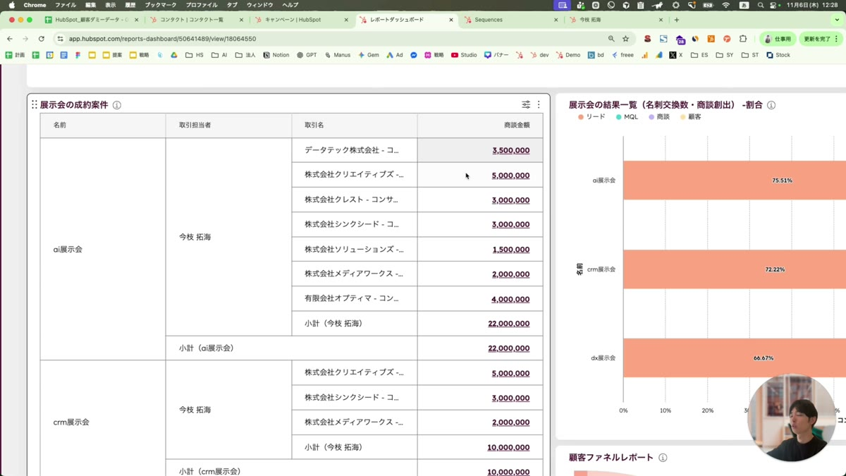 HubSpotは、展示会からの商談数・受注額を自動集計します。ダッシュボードでリアルタイムに確認できるため、「AI展から5件の商談が生まれ、そのうち2件が受注し、合計500万円の売上になった」という情報を瞬時に把握できます。