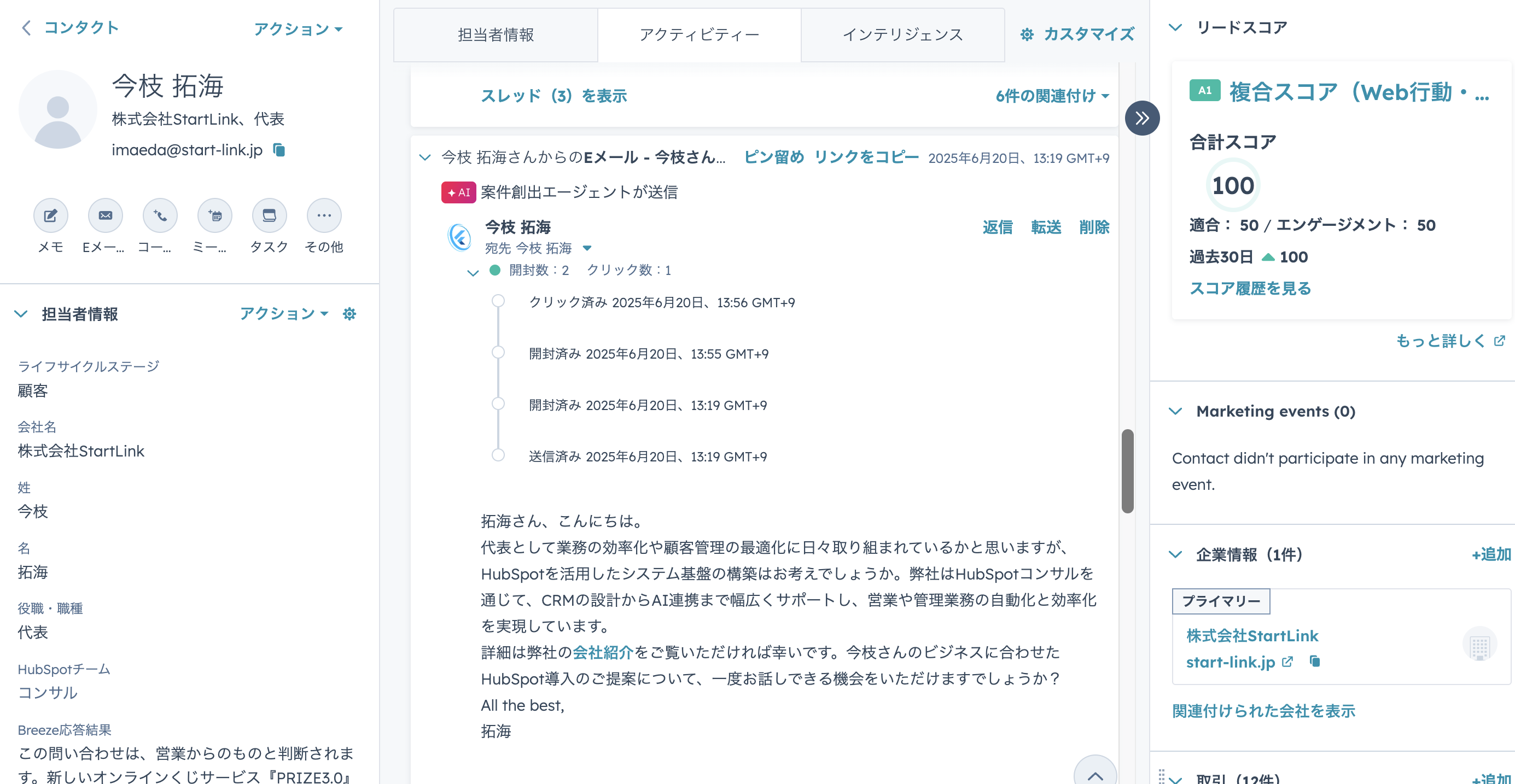 HubSpotのメールトラッキング機能を使えば、送信したメールが相手に開封されたか、添付した資料が閲覧されたかなどが、リアルタイムで分かります。メールを開封したタイミングで通知を受け取ることで、顧客の関心が高まっている「ホットな瞬間」を逃さず、最適なタイミングで電話や次のアクションに移ることができます。