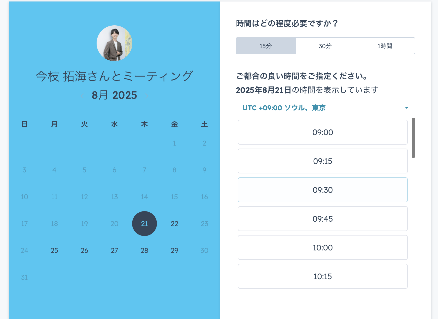 HubSpotのミーティング自動調整機能を使えば、GoogleカレンダーやOutlookカレンダーと連携し、自分の空いている時間枠を自動で顧客に提示することができます。顧客は提示されたカレンダーから好きな時間を選ぶだけで、日程調整が完了します。