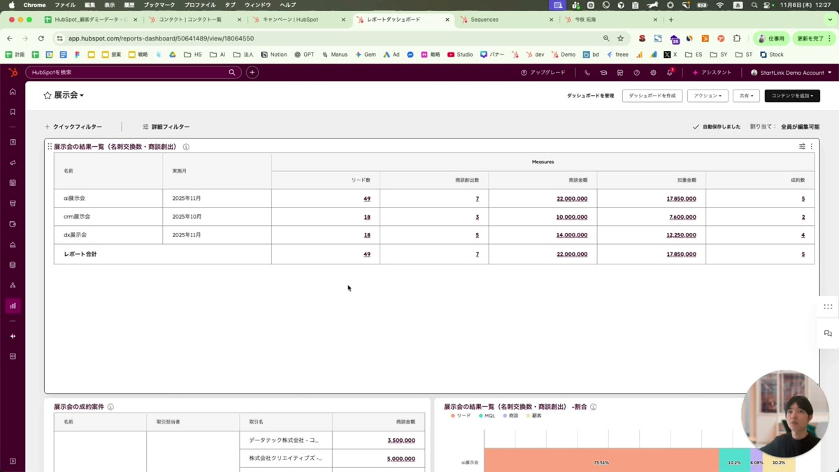 日々の営業活動を正確に記録していけば、それは貴重なデータとなり、次の一手を見出すための道標となります。HubSpotのレポート機能は、ビジュアル的に優れており、リアルタイムに数字を可視化できます。
