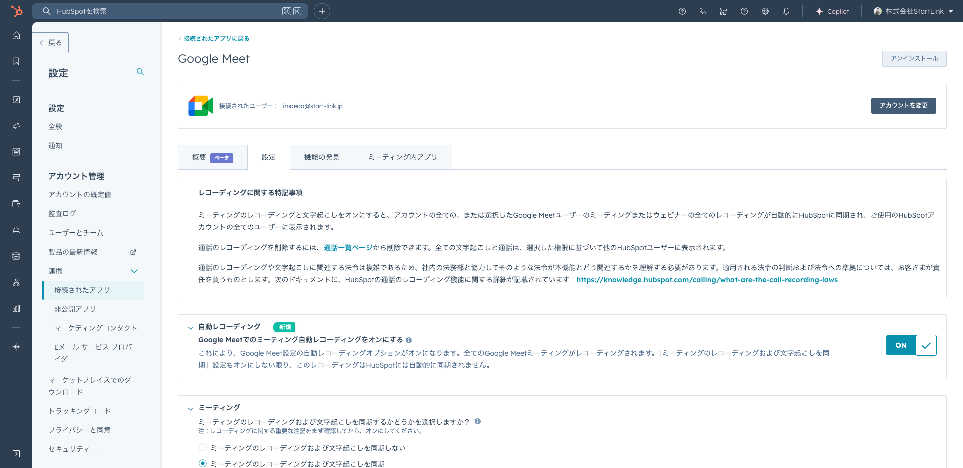 HubSpotとGoogle Meet連携(標準アプリ)