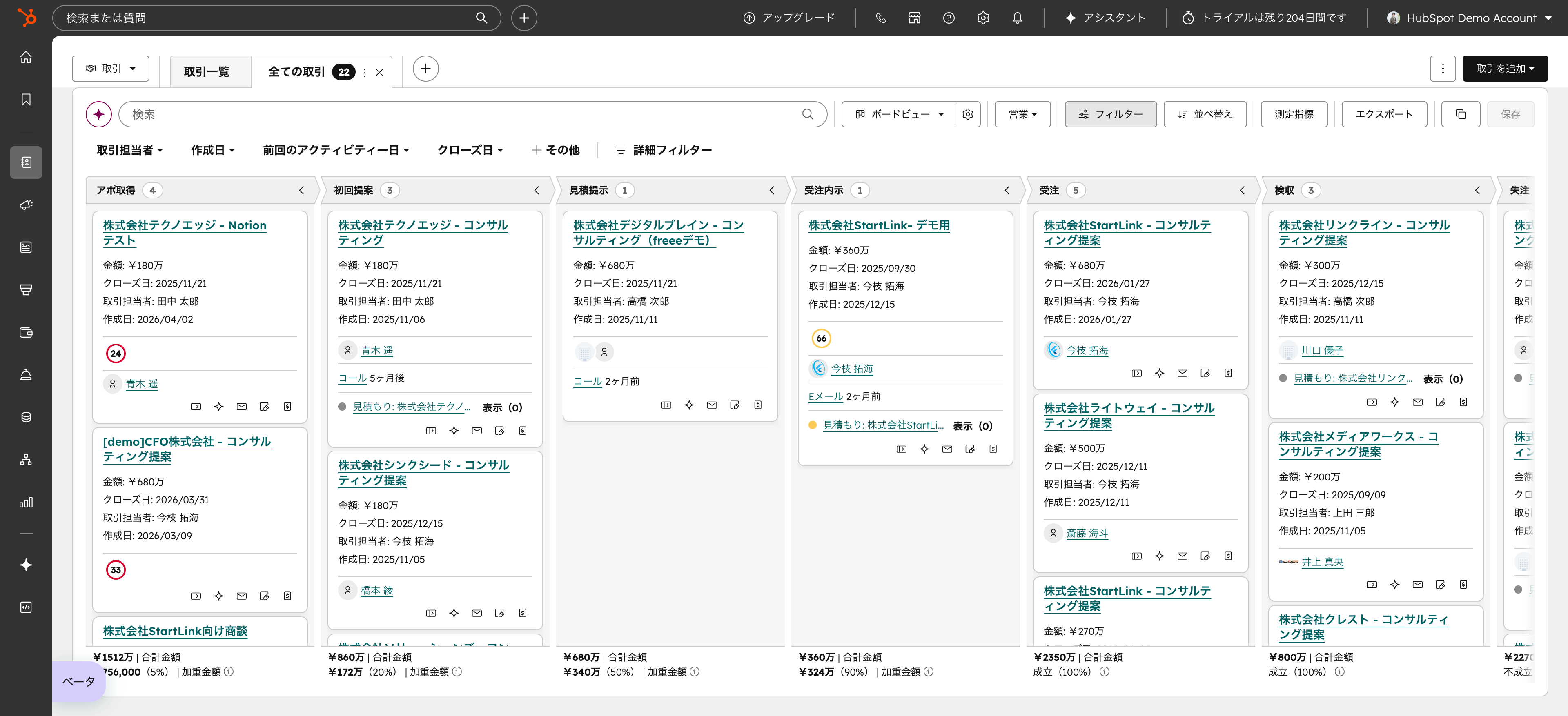 対応可能です。HubSpotのパイプラインは任意のステージ数と期間で設計でき、6ヶ月〜1年以上の長期商談にも対応します。タスクの自動生成やフォローアップの自動リマインダーを設定することで、長期商談の追跡漏れを防ぐことができます。