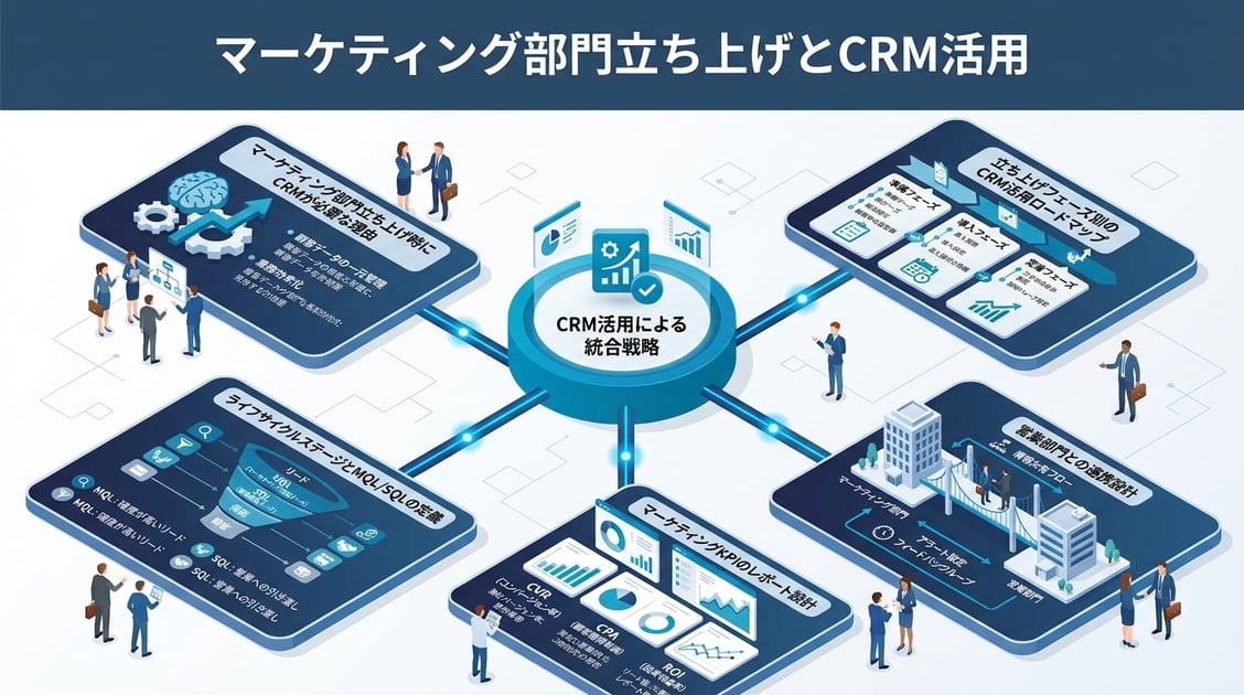 マーケティング部門の立ち上げにおけるCRM活用とは、部門新設の初期段階からCRMを基盤に据え、リード獲得→ナーチャリング→営業連携→成果測定までの一気通貫の仕組みを構築することで、少人数でも再現性のあるマーケティング組織を作る設計手法です。