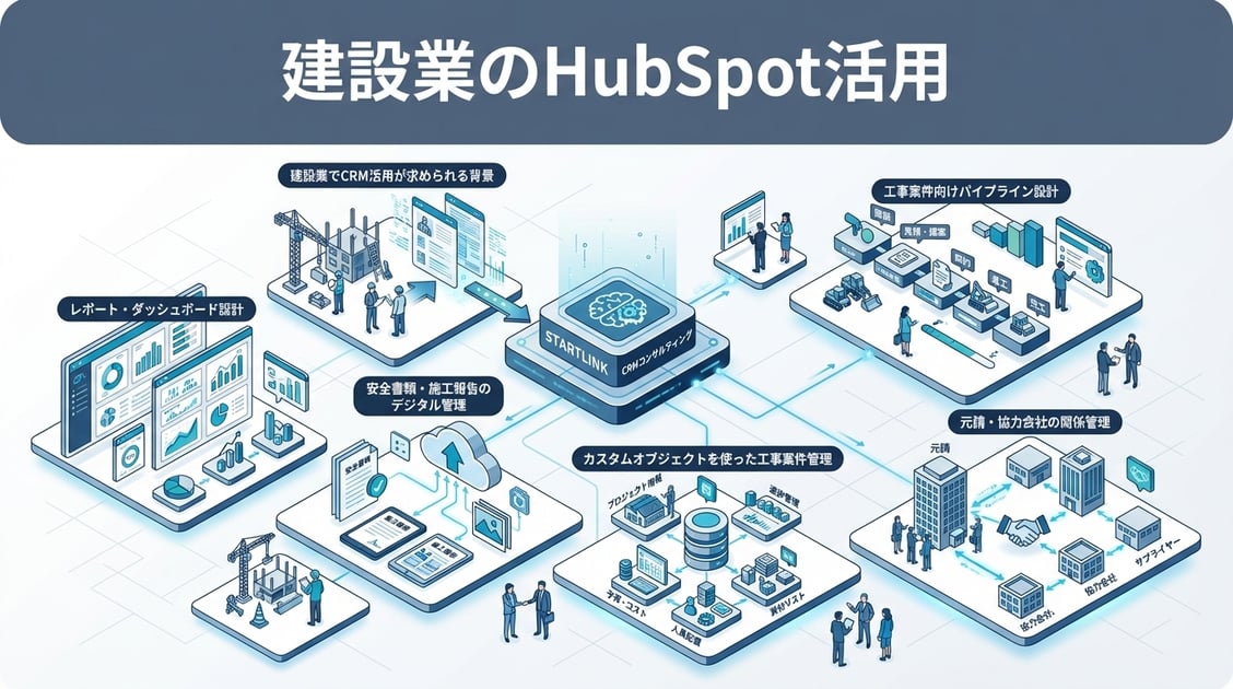 建設業におけるHubSpot活用とは、工事案件の受注プロセス管理、元請・下請・協力会社のリレーション管理、安全書類・施工報告などの業務プロセスをCRMに集約し、属人的な管理から脱却するための設計手法です。