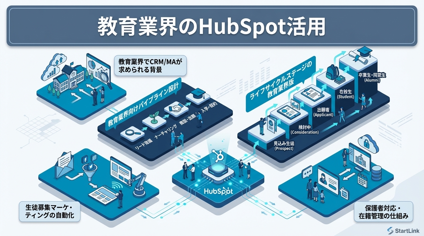 この記事では、教育業界でHubSpotを導入する際の設計思想、パイプライン・ライフサイクルステージの設計例、具体的な活用シーンを解説します。 この分野の体系的な情報は業界別HubSpot活用ガイドでまとめています。