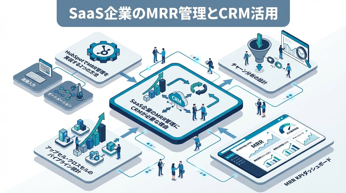 SaaS企業のMRR管理におけるCRM活用とは、New MRR・Expansion MRR・Contraction MRR・Churned MRRの4つのカテゴリをCRM上で追跡し、チャーン分析からアップセル施策まで一気通貫でデータドリブンに実行する設計手法です。