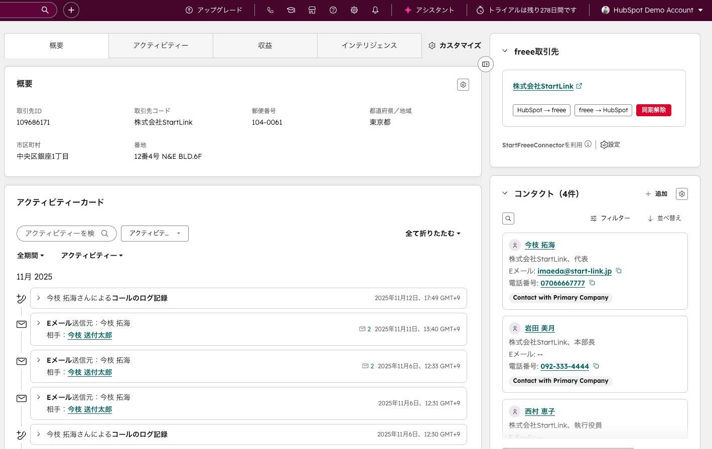 こちらが、このアプリによって会社名が完全一致した場合に同期することが可能ですので、HubSpotとfreeeで一意な会社データを管理することができるようになりました。また、双方のデータを同期する機能もあるので、例えば、freee取引先にある住所をHubSpotの会社に同期するということも気軽にできるようになり、データクレンジングの機能としても使うことができます。