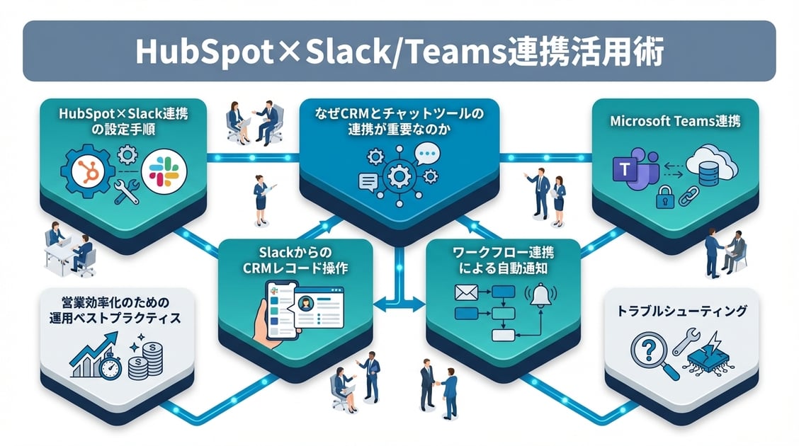 この記事では、HubSpotとSlack/Teamsの連携設定方法、通知のカスタマイズ、CRMレコードの共有、ワークフロー連携による自動化、そして運用のベストプラクティスまでを網羅的に解説します。