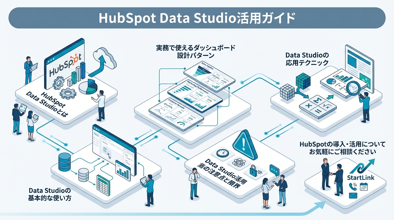 本記事では、Data Studioの基本的な使い方から実務で成果を出すための設計ポイントまで、HubSpot導入支援の現場で見えてきた活用のコツを交えて解説します。 この分野の体系的な情報はHubSpotアップデートガイドでまとめています。