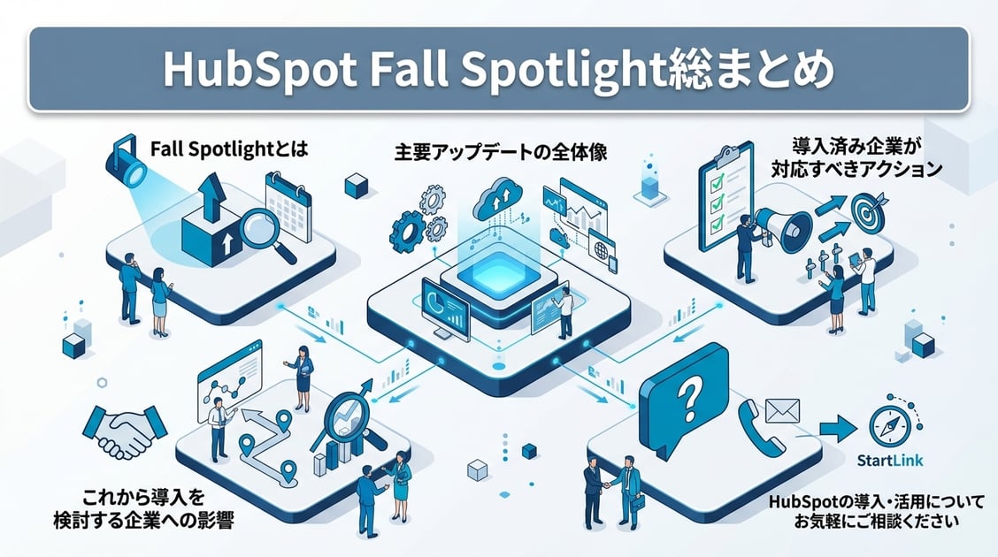 HubSpot Fall Spotlightは、秋のINBOUNDと連動した大型アップデートであり、AI機能の進化やプラットフォームの基盤改善が含まれます。導入済み企業は既存環境への影響を確認し、検討中の企業は最新のプラン内容を踏まえた導入設計を行いましょう。