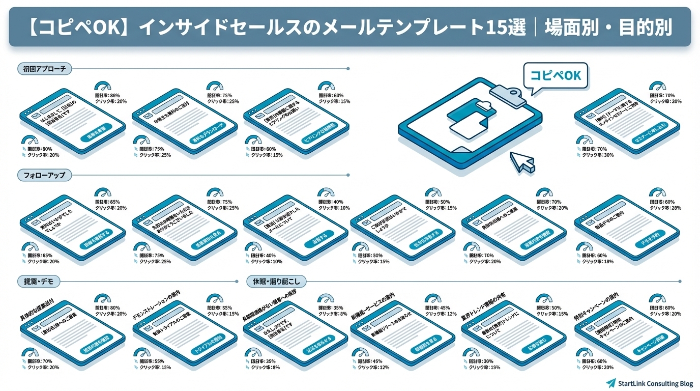 この記事では、インサイドセールスの現場で使える15のメールテンプレートを、場面別・目的別に整理してお届けします。コピペしてすぐに使えるように設計していますので、自社の状況に合わせてカスタマイズしてご活用ください。