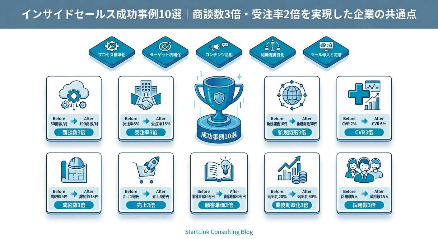 この記事では、BtoB企業のインサイドセールス成功事例10選を「課題→施策→成果」の形式で紹介し、成功企業に共通する5つのパターンと、自社への応用チェックリストを解説します。