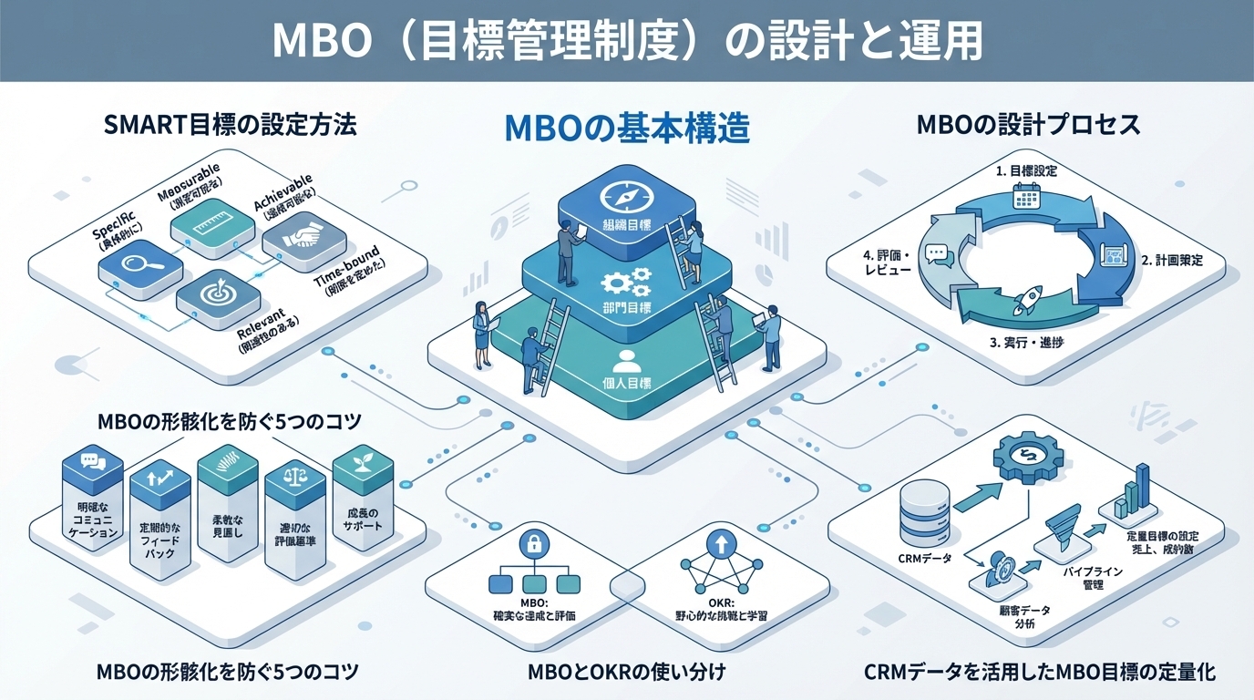 metaDescription: "MBO(目標管理制度)の効果的な設計と運用方法を解説。SMART目標の設定、評価プロセス、MBOの形骸化を防ぐ運用のコツ、OKRとの使い分けまで実務的に紹介します。"