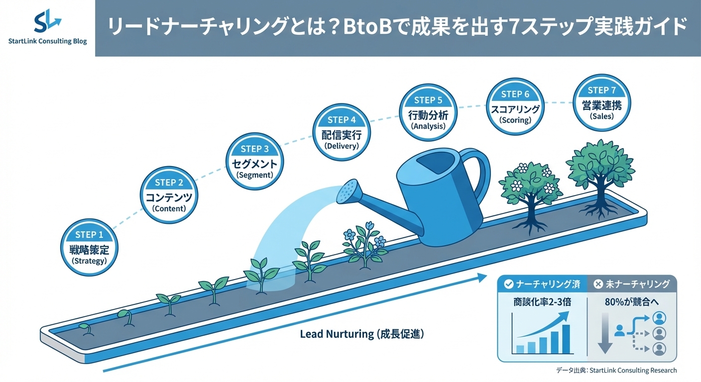 リードナーチャリングは、BtoBマーケティングにおいて「リード獲得」と「商談創出」を繋ぐ重要なプロセスです。本記事で紹介した7ステップのフレームワークを活用することで、体系的なナーチャリング体制を構築できます。