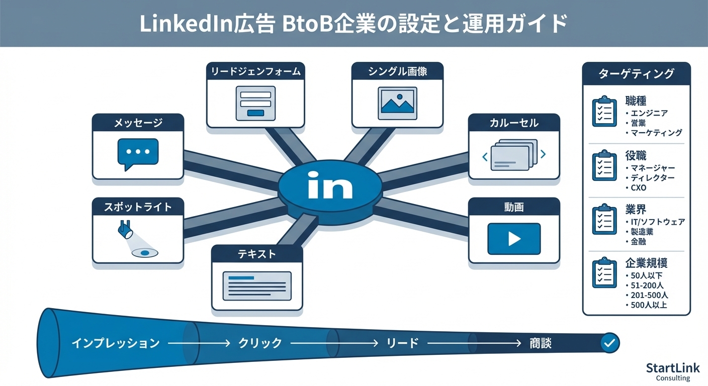 本記事では、LinkedIn広告の種類・ターゲティング設定・クリエイティブ制作・運用最適化・効果測定まで、成果を出すために必要な知識を網羅的に解説します。