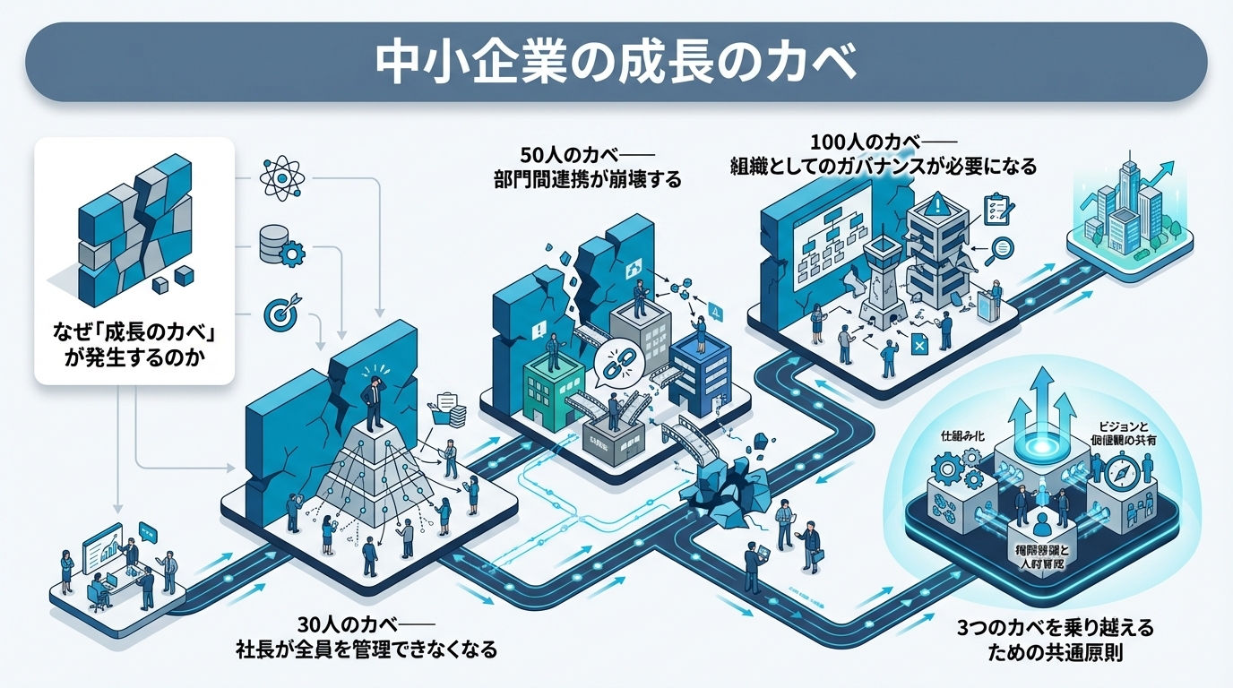 成長のカベは、企業が成長している証拠でもあります。30人で社長のボトルネック化、50人で部門間の断絶、100人でガバナンスの課題——各段階で必要な組織設計は異なりますが、共通するのは「人に依存する運営から、仕組みに基づく運営への移行」です。