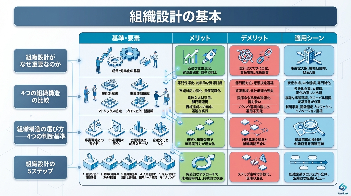 組織設計は「正解」が1つあるのではなく、自社の事業フェーズ・事業数・規模に応じた「最適解」を選ぶ作業です。機能別→事業部制→マトリクスと、組織が成長するにつれて構造を進化させていくのが一般的なパターンです。