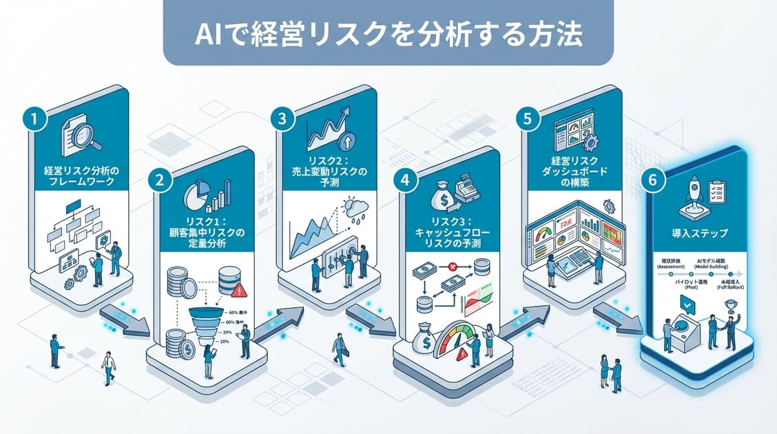 本記事では、AIで経営リスクを分析する方法について、顧客集中リスク・売上変動リスク・キャッシュフローリスクの3つの主要リスクの定量化手法を解説しました。