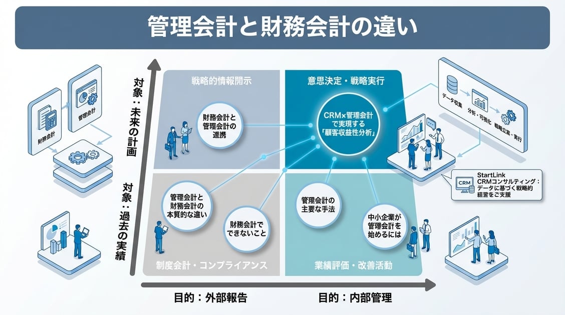 端的に言えば、財務会計は「過去の実績を正確に記録するもの」、管理会計は「未来の意思決定を支援するもの」です。