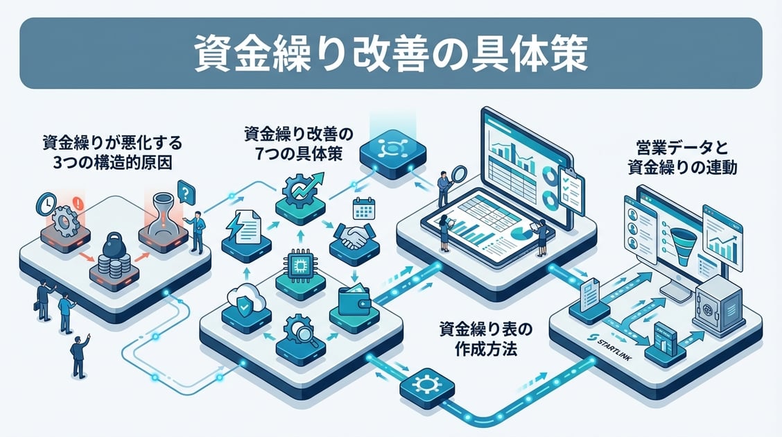 資金繰りの改善で最も重要なのは、「見える化」です。月次のキャッシュフロー計算書を作成し、営業CF・投資CF・財務CFの推移を把握します。キャッシュフロー経営の実践で詳しい方法を解説しています。
