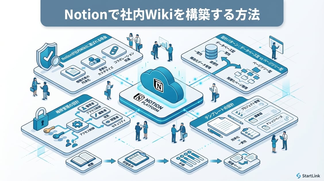 社内Wikiの構築にNotionを選ぶ企業が急増しています。Notionの2024年発表によると、全世界で1億人以上のユーザーがNotionを利用しており、日本でもメルカリ、SmartHR、ラクスルなど成長企業を中心に社内Wikiの基盤として採用が進んでいます。しかし、Notionは自由度が高い分、設計なしに始めると「カオスなページの山」になりがちです。本記事では、Notionで定着する社内Wikiを構築するための設計・権限管理・運用ルールを解説します。