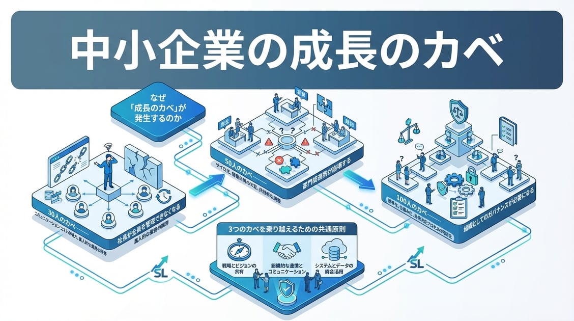 中小企業は従業員30人・50人・100人の節目で、それぞれ「社長のボトルネック化」「部門間連携の断絶」「ガバナンスの不備」という異なる成長のカベに直面します。共通する乗り越え方は「人に依存する運営から、仕組みに基づく運営への移行」であり、仕組み化・可視化・言語化を段階的に進めることが鍵です。