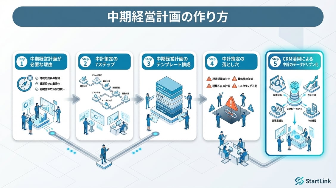 中期経営計画の作り方を実務に落とし込むには、CRMツールの活用が不可欠です。詳しくは「CRM導入の進め方完全ガイド|準備・ツール選定・データ移行・定着化の全ステップ」で解説しています。