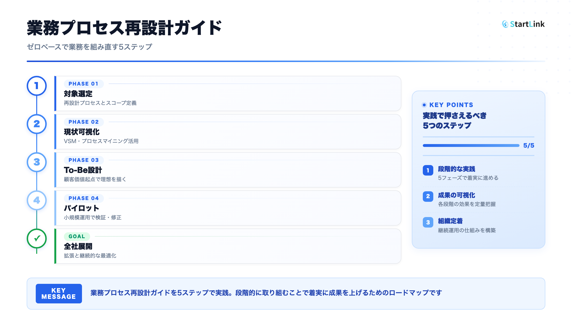 5ステップで進めます。①対象プロセスの選定とスコープ定義、②現状プロセス(As-Is)の可視化と分析、③理想プロセス(To-Be)のゼロベース設計、④パイロット部門での検証と修正、⑤全社展開と定着化です。VSM(バリューストリームマッピング)やスイムレーンダイアグラムを活用して可視化します。