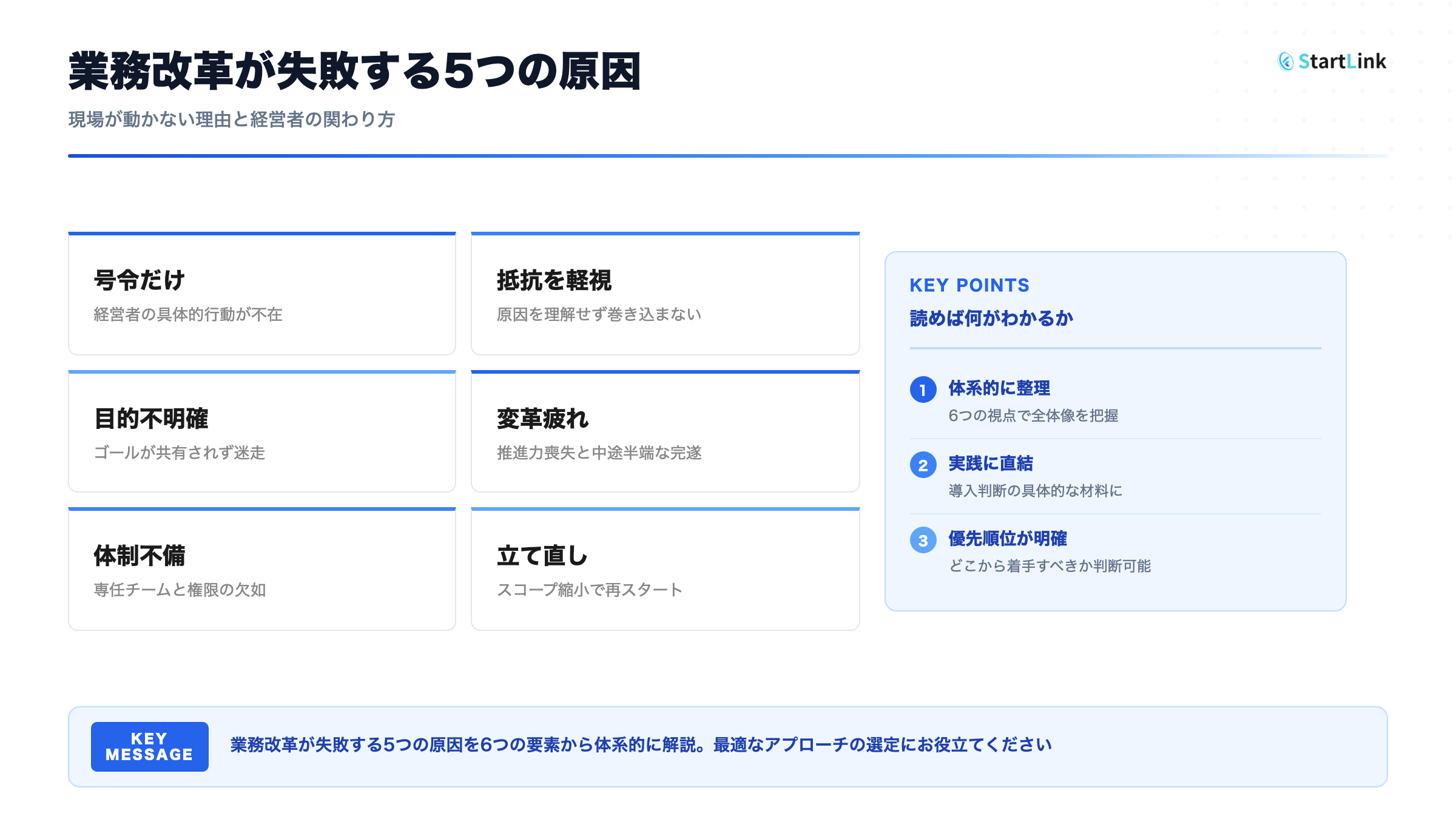 - 業務改革が失敗する5つの組織的原因 — 技術的な問題ではなく、人と組織に起因する失敗パターンを体系的に理解できます