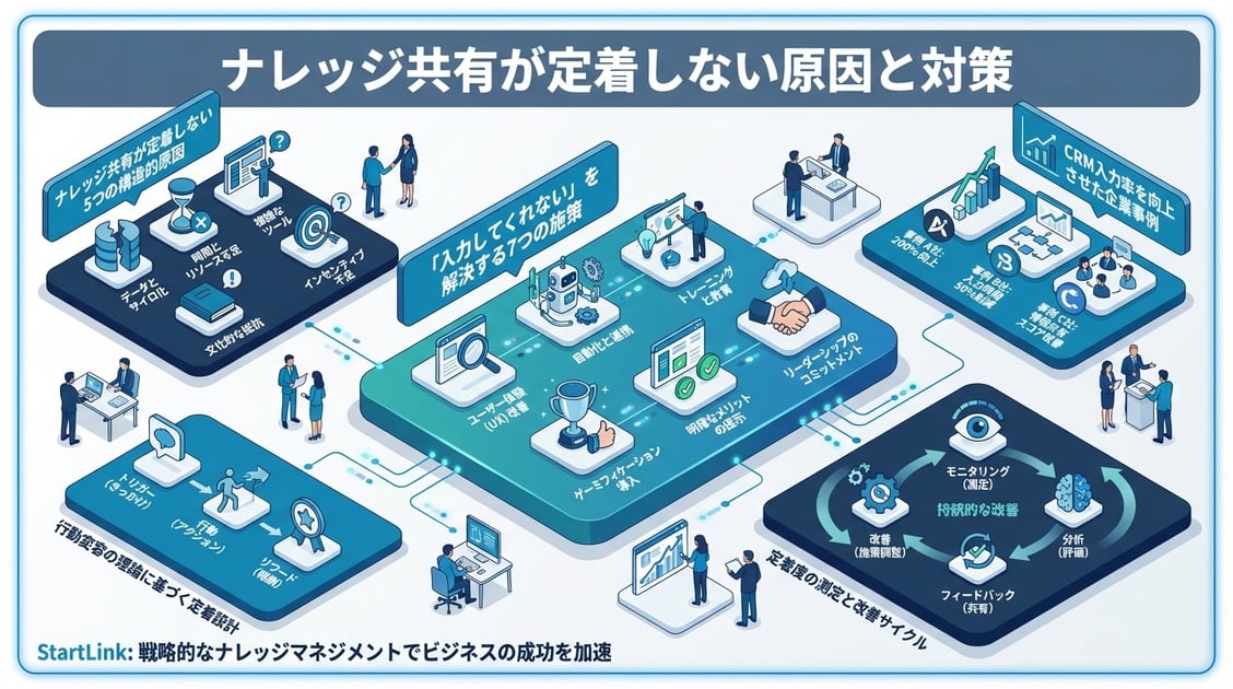 本記事では、ナレッジ共有が定着しない5つの構造的原因を分析し、「入力してくれない」問題を解決する7つの具体的な施策を解説しました。