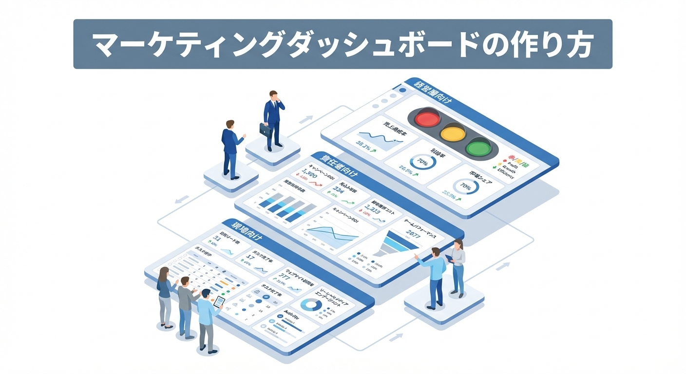 マーケティングダッシュボードは、「何を見るか」以上に「誰のために、どんなアクションにつなげるか」を設計することが重要です。経営層向け、マーケ責任者向け、現場担当者向けのそれぞれに最適な指標と粒度を設定し、1ダッシュボードの指標は7つ以内に絞りましょう。