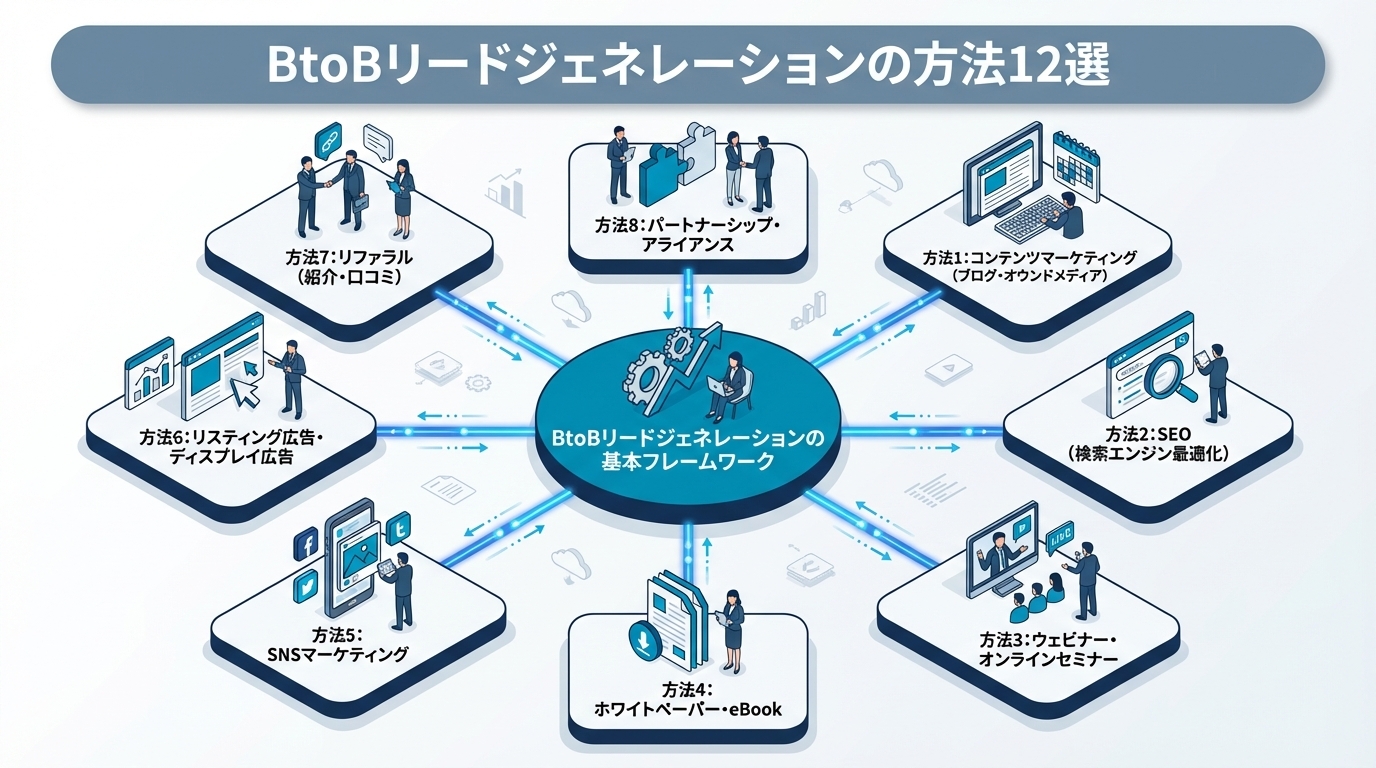 12の手法を個別に見る前に、リードジェネレーション全体のフレームワークを整理しておきましょう。