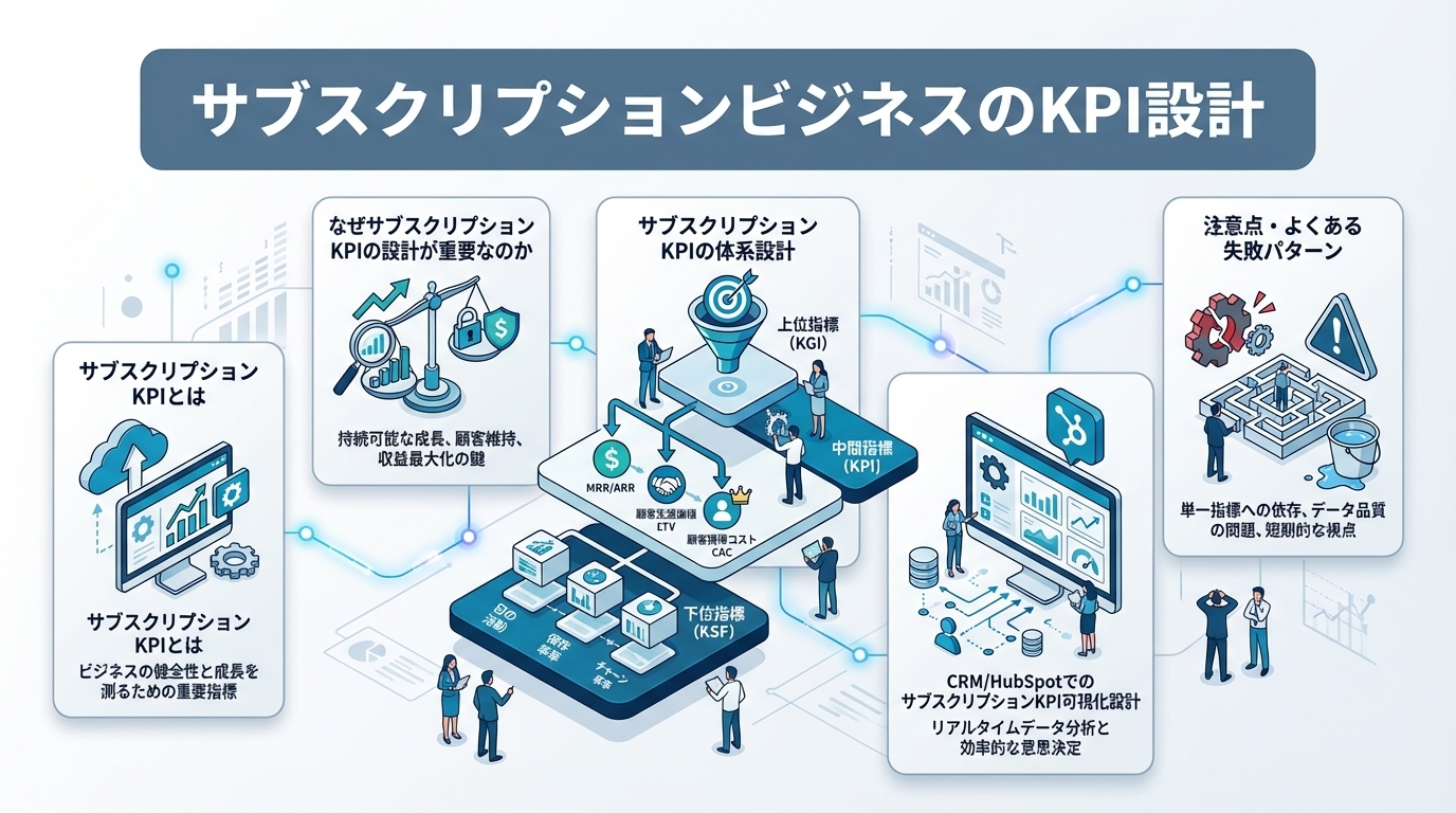 metaDescription: サブスクリプションビジネスの収益管理に必要なKPI(MRR・ARR・NRR・チャーンレート等)の定義と設計方法を解説。CRM/HubSpotでの可視化・ダッシュボード構築の実務ノウハウを体系的に紹介します。
