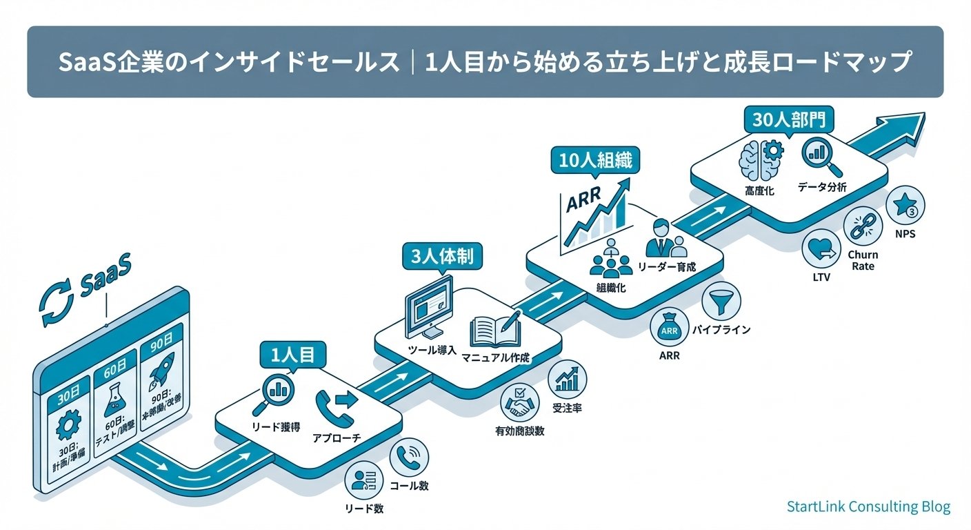 この記事では、SaaS企業のインサイドセールスを1人目から立ち上げるための採用・育成方法、最初の90日間の行動計画、そしてフェーズ別の成長ロードマップを解説します。