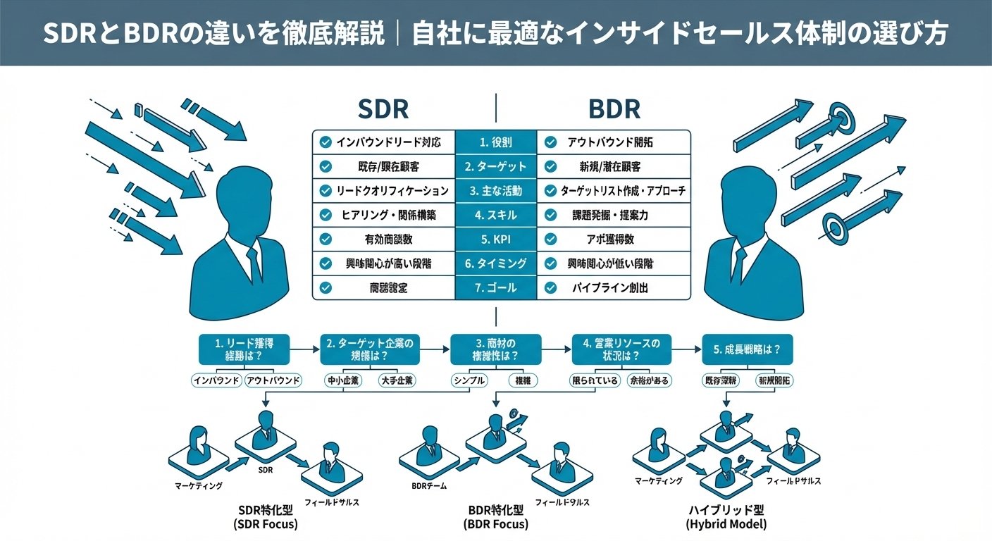 まずはSDRまたはBDRの片方から始め、成果とデータを蓄積しながら、必要に応じてハイブリッド型へ拡張していくアプローチが現実的です。