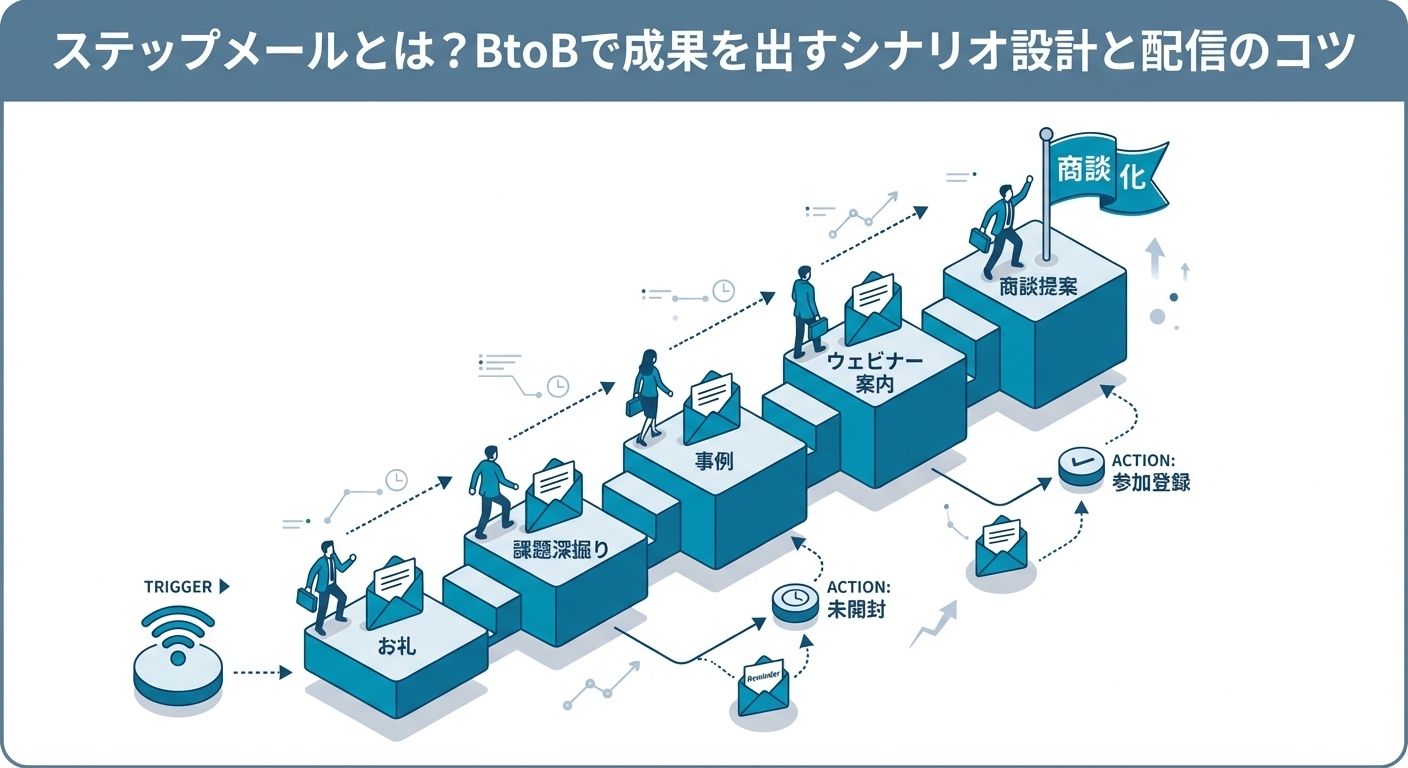本記事では、ステップメールの基本定義からメルマガとの違い、BtoBでのシナリオ設計の基本、最適な配信タイミング、効果測定指標まで、ステップメールで成果を出すために必要な知識を体系的に解説します。