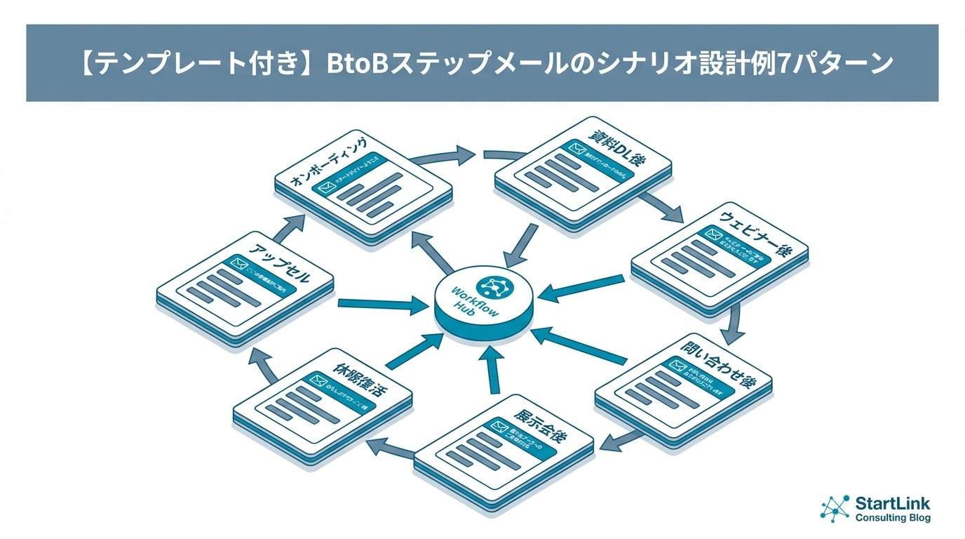 本記事では、BtoBで頻出する7つのシナリオパターン(資料DL後、ウェビナー参加後、問い合わせ後、展示会後、休眠復活、アップセル、オンボーディング)について、それぞれ具体的な例文テンプレートと設計のポイントを提供します。そのまま自社に適用できる実践的な内容です。