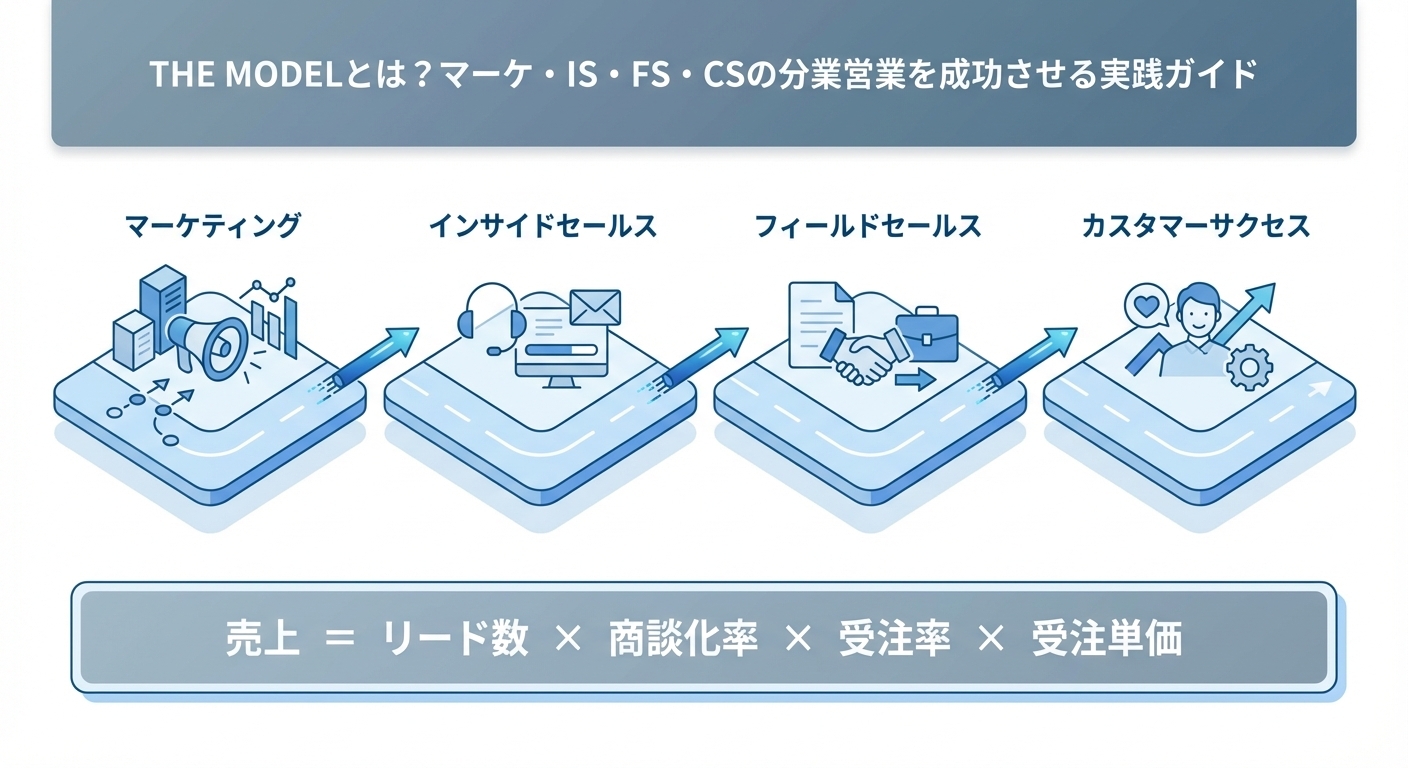 「営業の属人化が解消できない」「マーケが集めたリードが商談につながらない」「受注後のフォローが手薄で解約が増えている」——こうした課題に対する解決策として、多くのBtoB企業が注目しているのが「THE MODEL」と呼ばれる営業プロセスモデルです。
